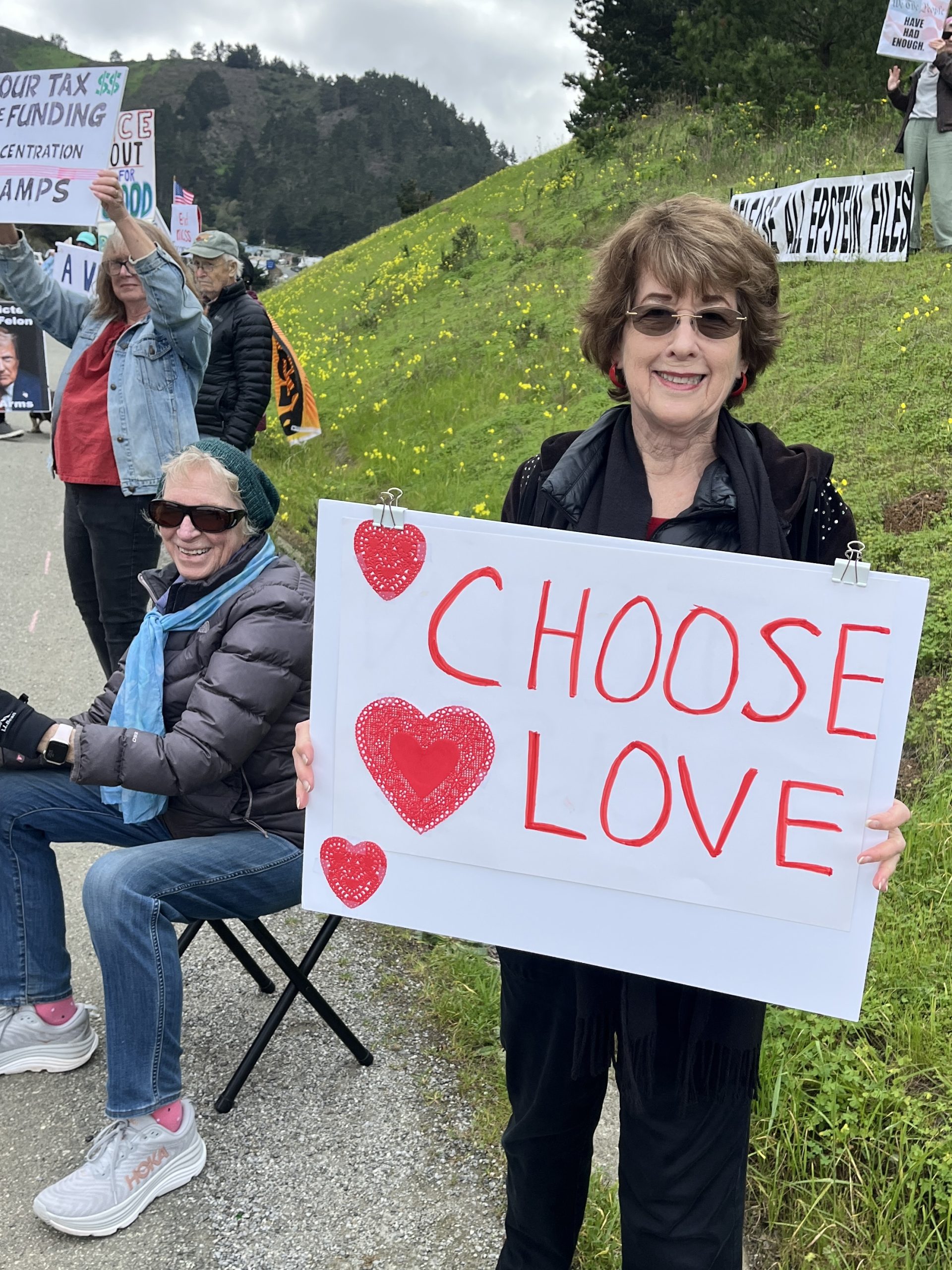 Join us in choosing love over hate this Valentine’s Day – in our communities, our country, and the world. Photo captured at Indivisible’s weekly protests for democracy, featuring congregation member Linda Peebles. More information about the protests can be found here.